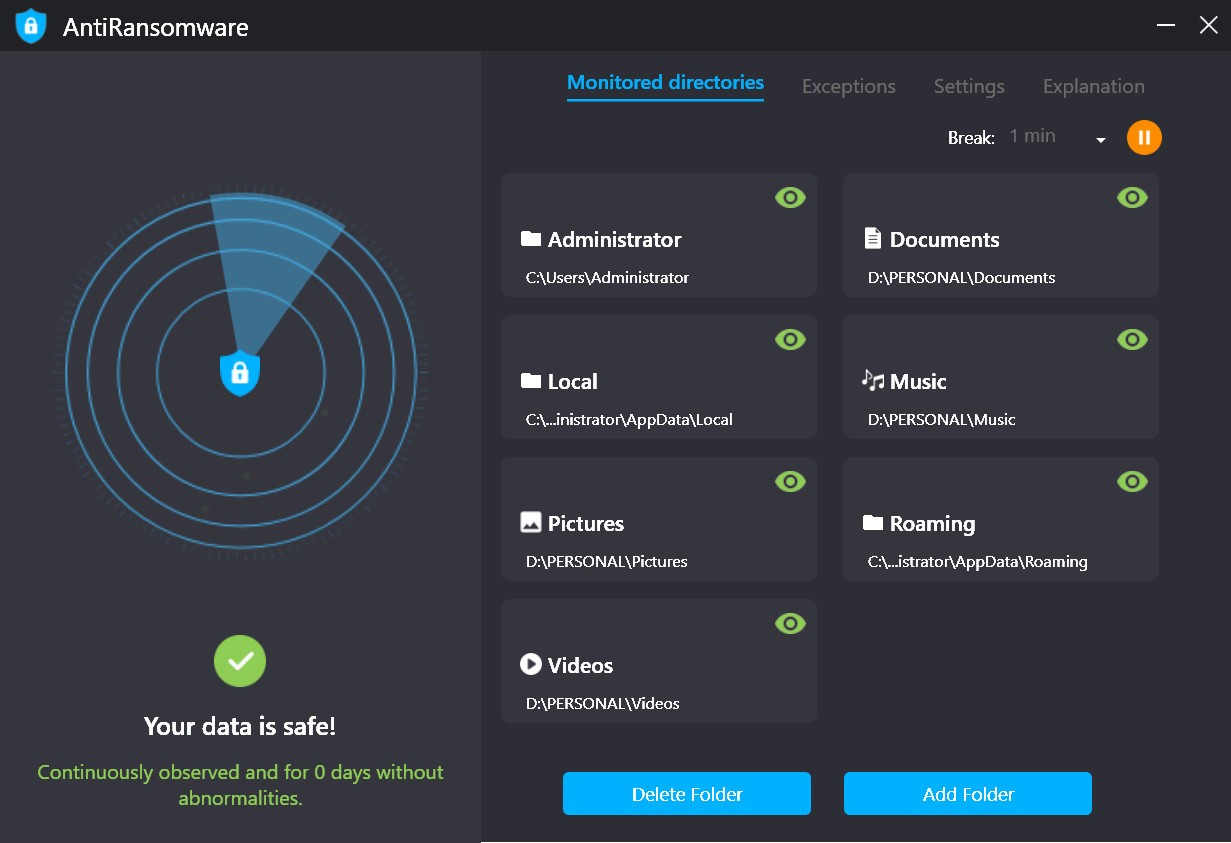 ההגנה הטובה ביותר מפני תוכנות כופר וחטיפת נתונים אי פעם! בשיתוף פעולה עם מומחים פיתחנו AntiRansomware המציעה לך הגנה יעילה מפני מה שמכונה תוכנת כופר. השומר עוקב אחר כל התהליכים ברקע ומעורר אזעקה למקרה שהקבצים במחשב שלך מוצפנים.