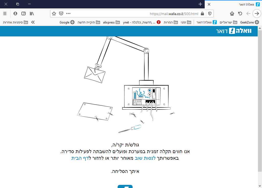 זה מספר שבועות שלא ניתן להיכנס ל וואלה דואר בדפדפן השועל . יש הודעה על תקלה זמנית (כבר כמה שבועות ) ובדפדפן כרום אין את ההודעה הזאת והכל תקין עם האתר וואלה .כמו כן עם האתר יד 2 .שמוצג הדף בחסר האפשרות בחירת הפריט .